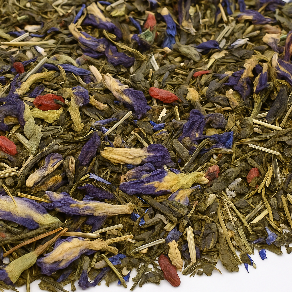 Eine lebendige Grünteemischung mit Schmetterlingserbsenblüten, die tiefblau aufbrüht und sich mit einem Spritzer Zitrusfrüchte in Lila verwandelt. Gojibeeren, Zitronengras, Granatapfel und Kornblumenblüten verleihen dieser optisch auffälligen Mischung Komplexität und natürliche Helligkeit. Ausbalanciert mit Sencha-Grüntee ist sie sowohl erfrischend als auch geschmackvoll – perfekt für Eistee oder Spa-ähnliche Präsentationen.